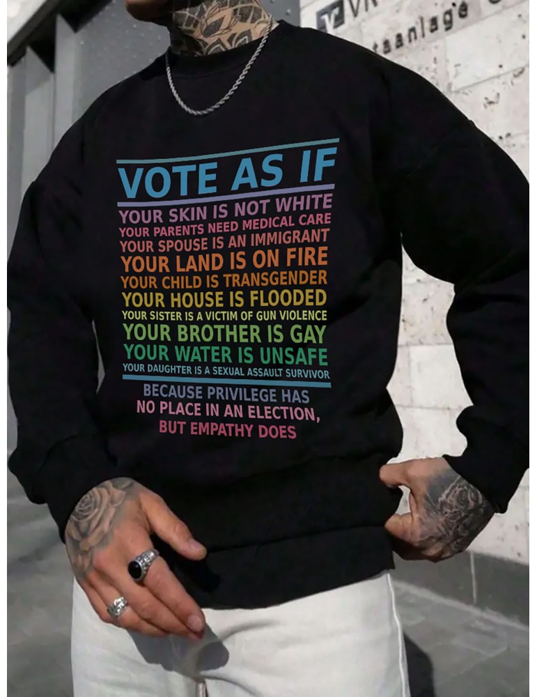 • 1pc Men'S Plus Size Casual French Terry Sweatshirt with Printed Empathy Message, Round Neck, Long Sleeve, Stretch Fabric, Regular Fit Top for Autumn and Winter