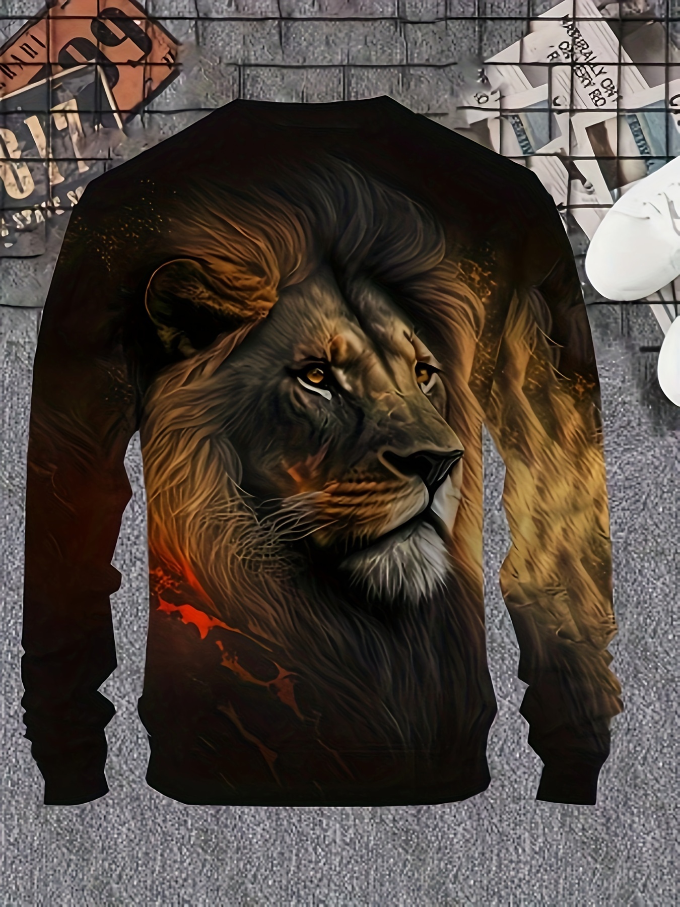 • Men'S Plus Size 3D Lion Head Print Sweatshirt, Casual Stretch Knit Top, Round Neck, Regular Fit, Polyester, Animal Print, Sports Style, Autumn/Winter Fashion