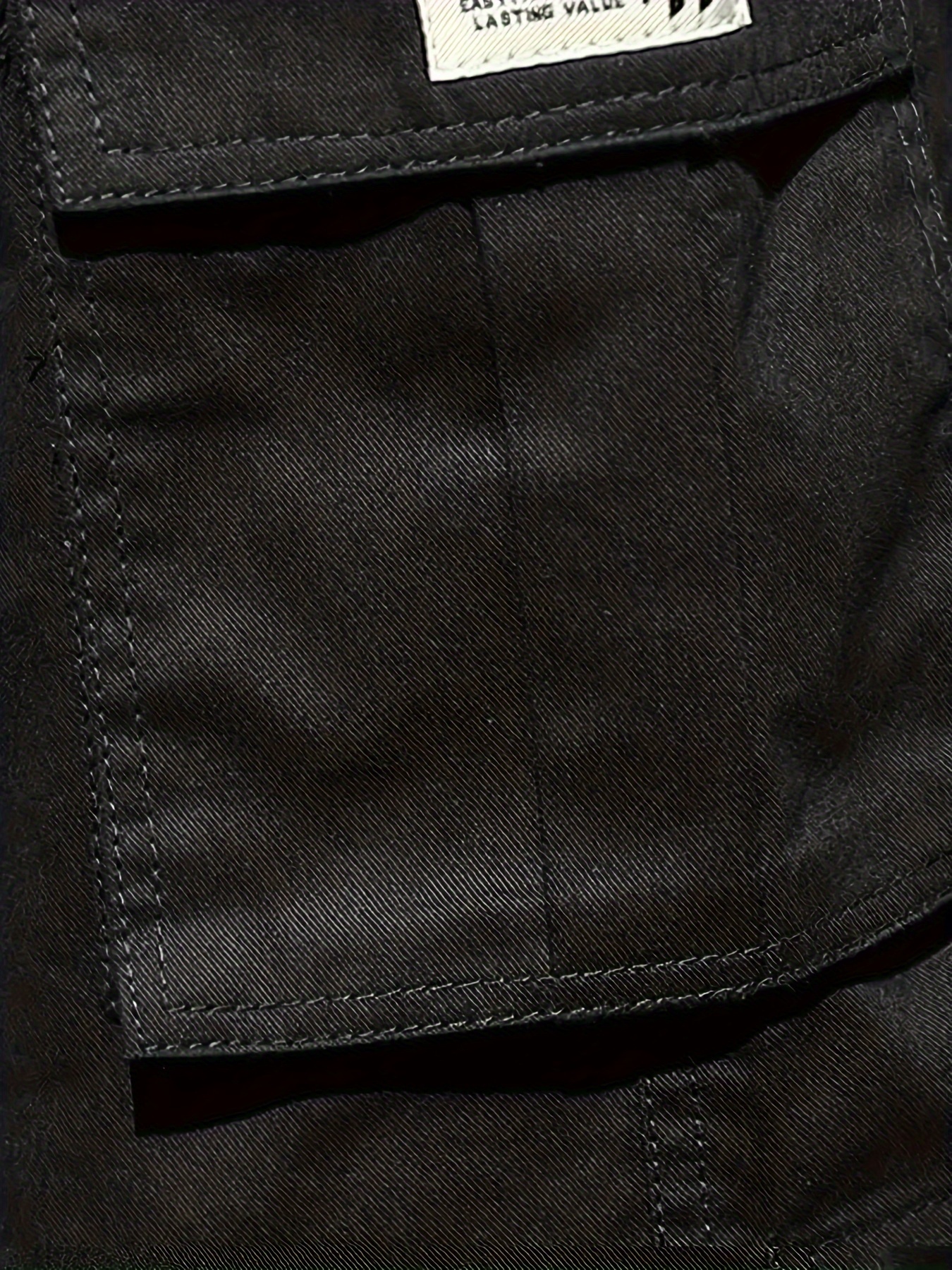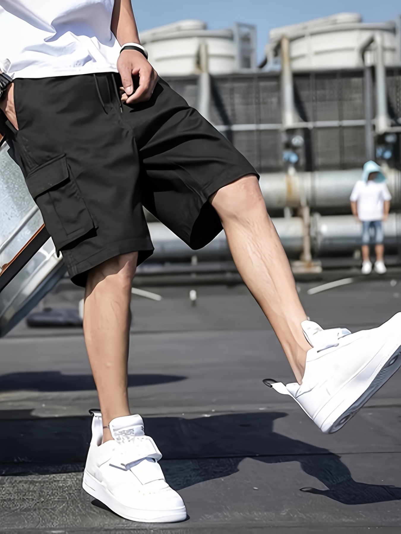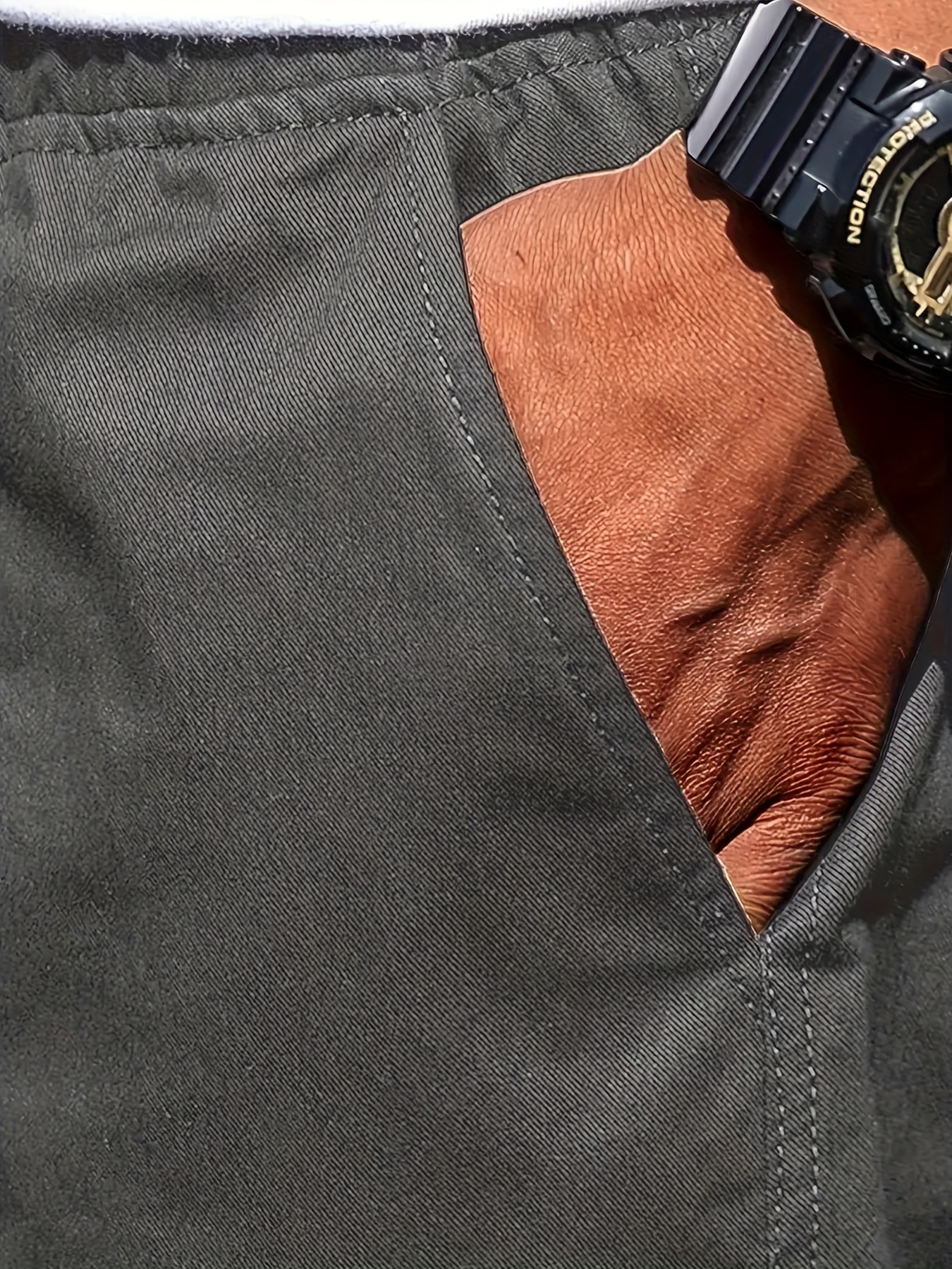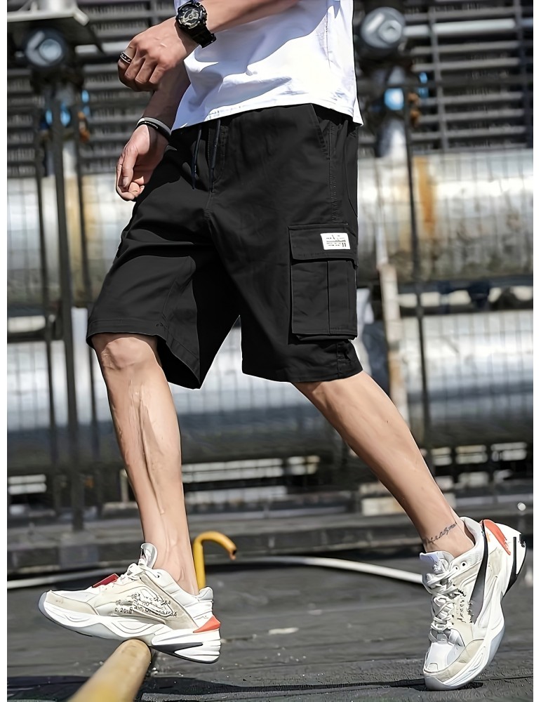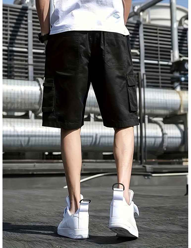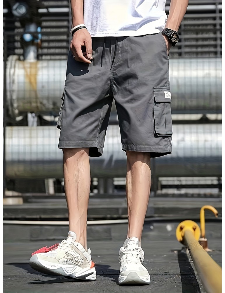 • Men's Fashion Cargo Shorts with Drawstring Waist, Solid Color, Polyester, Casual Workwear Style, Loose Fit, Woven, Non-Stretch Fabric, Multiple Pockets