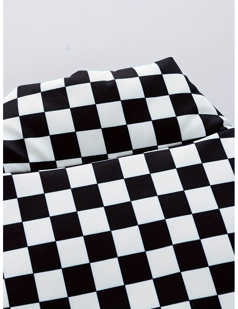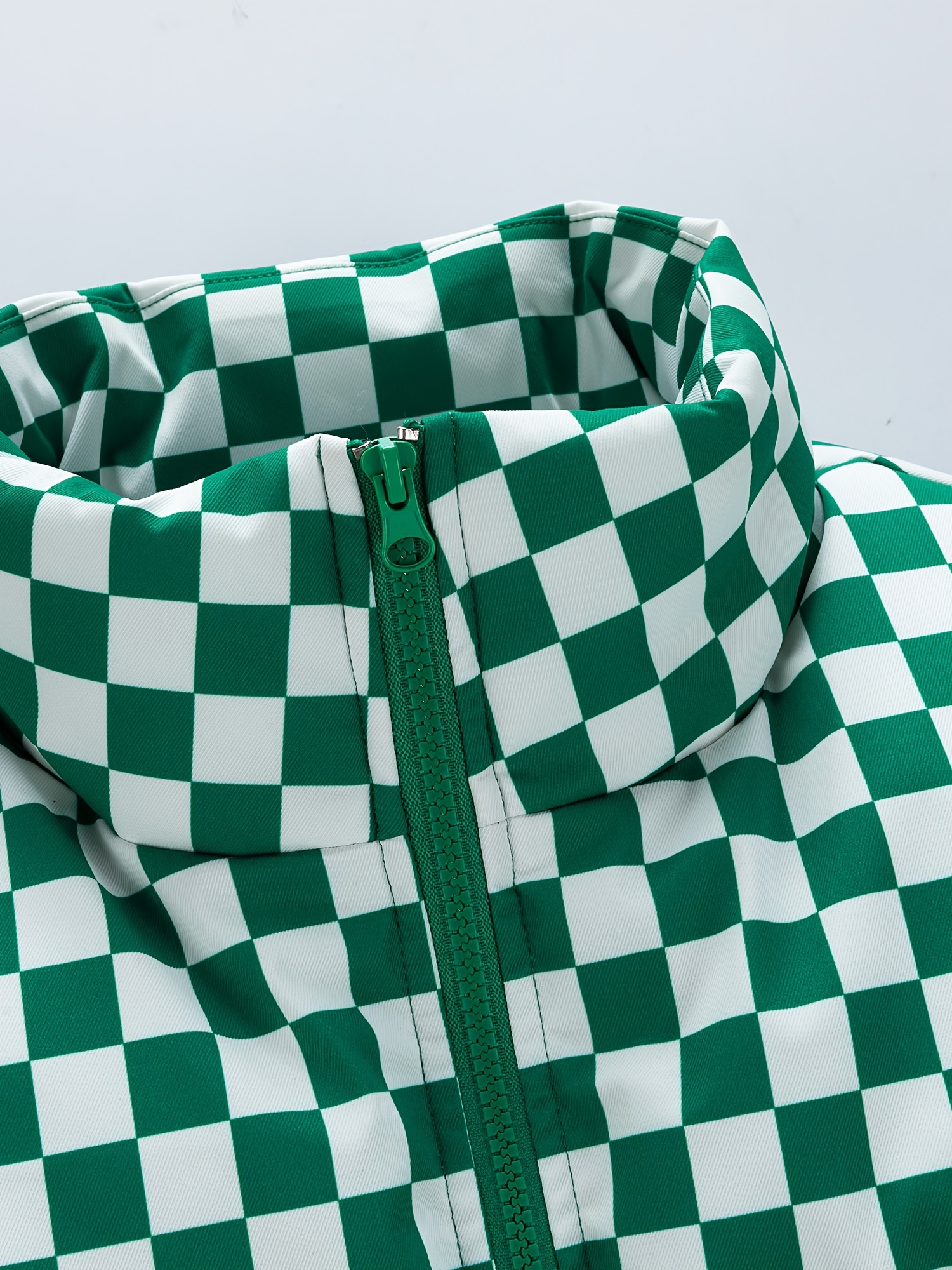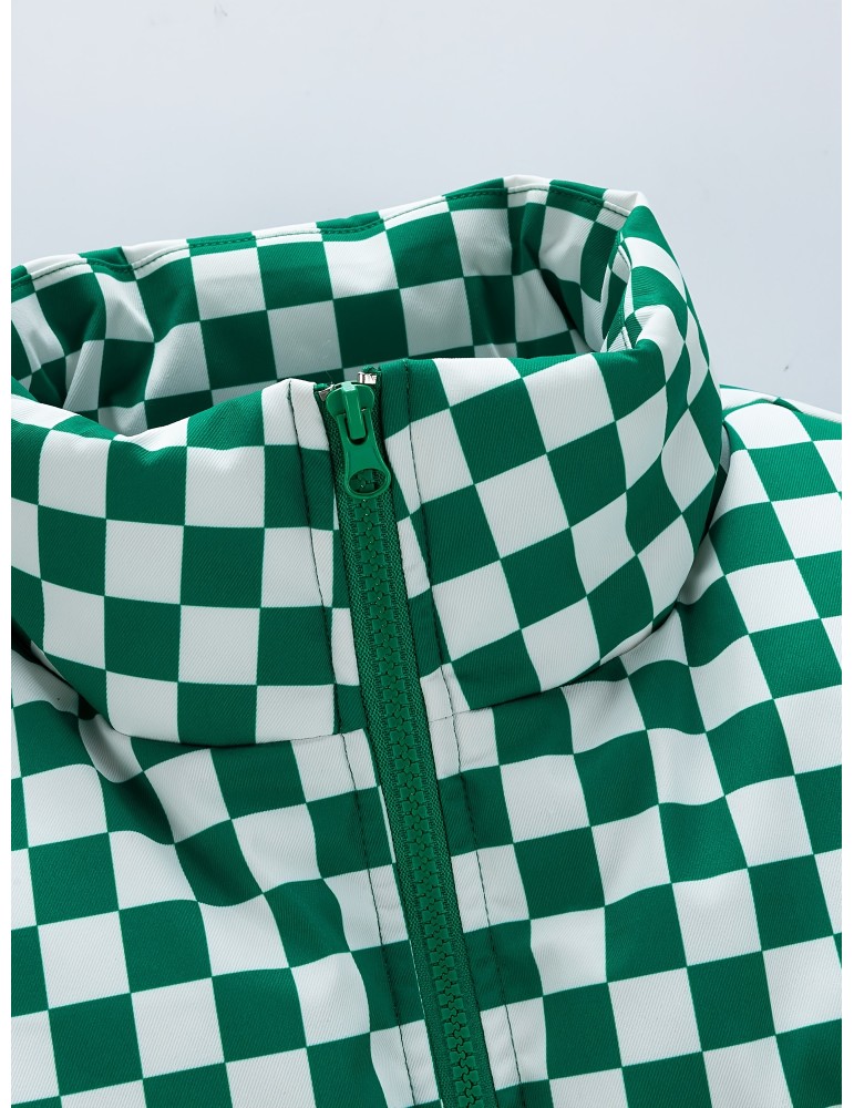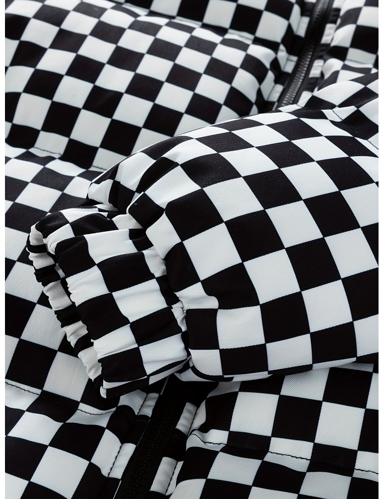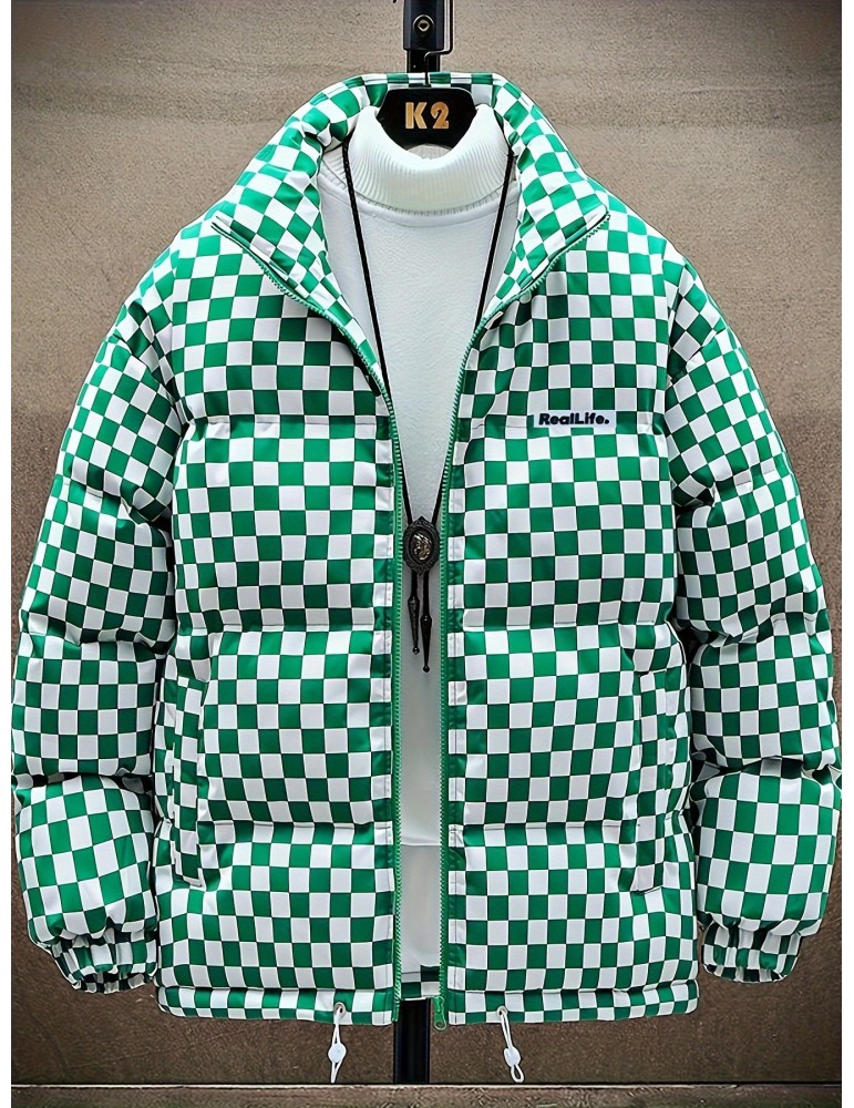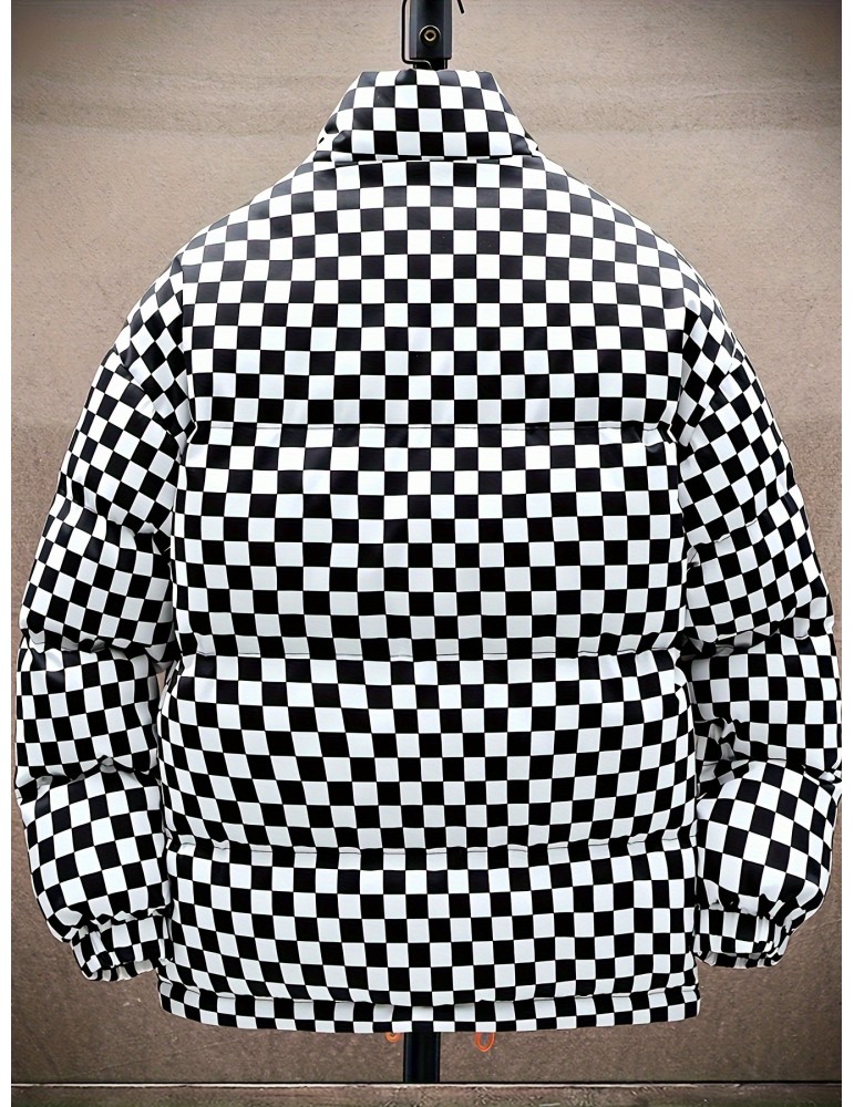 • Men's Stylish Checkered Puffer Coat With Pockets, Casual Breathable Stand Collar Zip Up Long Sleeve Warm Top For City Walk Street Hanging Winter Outdoor Activities