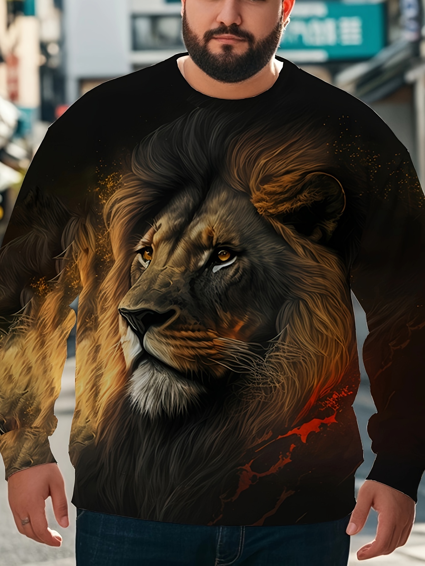 • Men'S Plus Size 3D Lion Head Print Sweatshirt, Casual Stretch Knit Top, Round Neck, Regular Fit, Polyester, Animal Print, Sports Style, Autumn/Winter Fashion