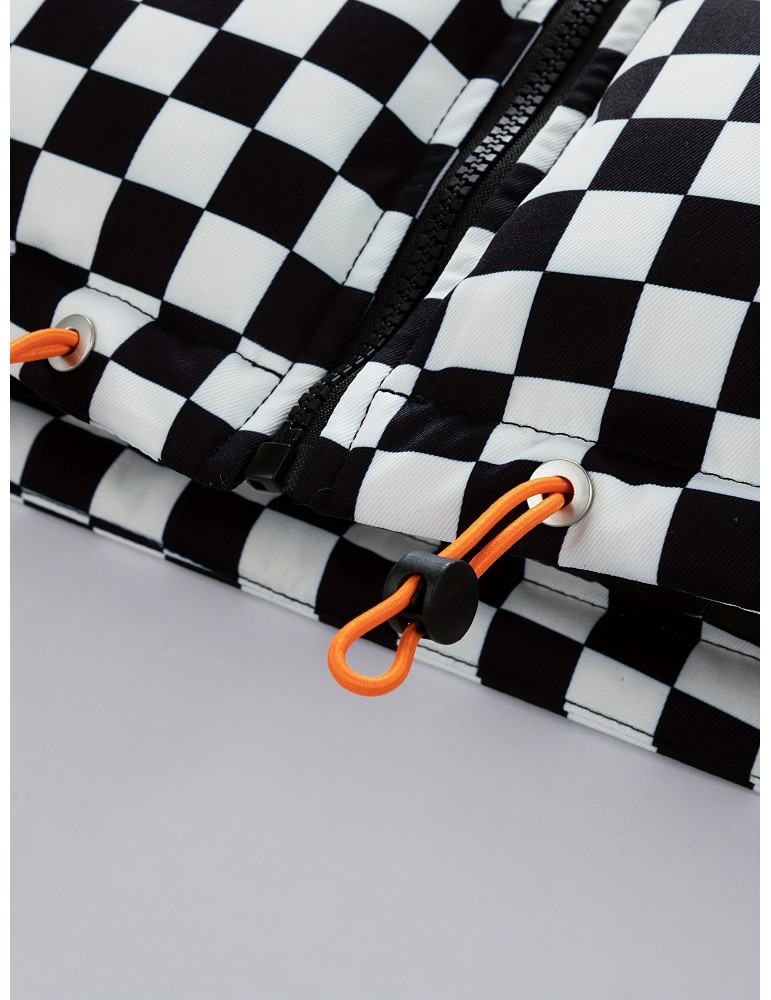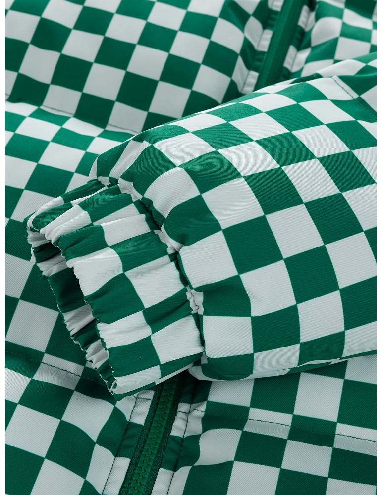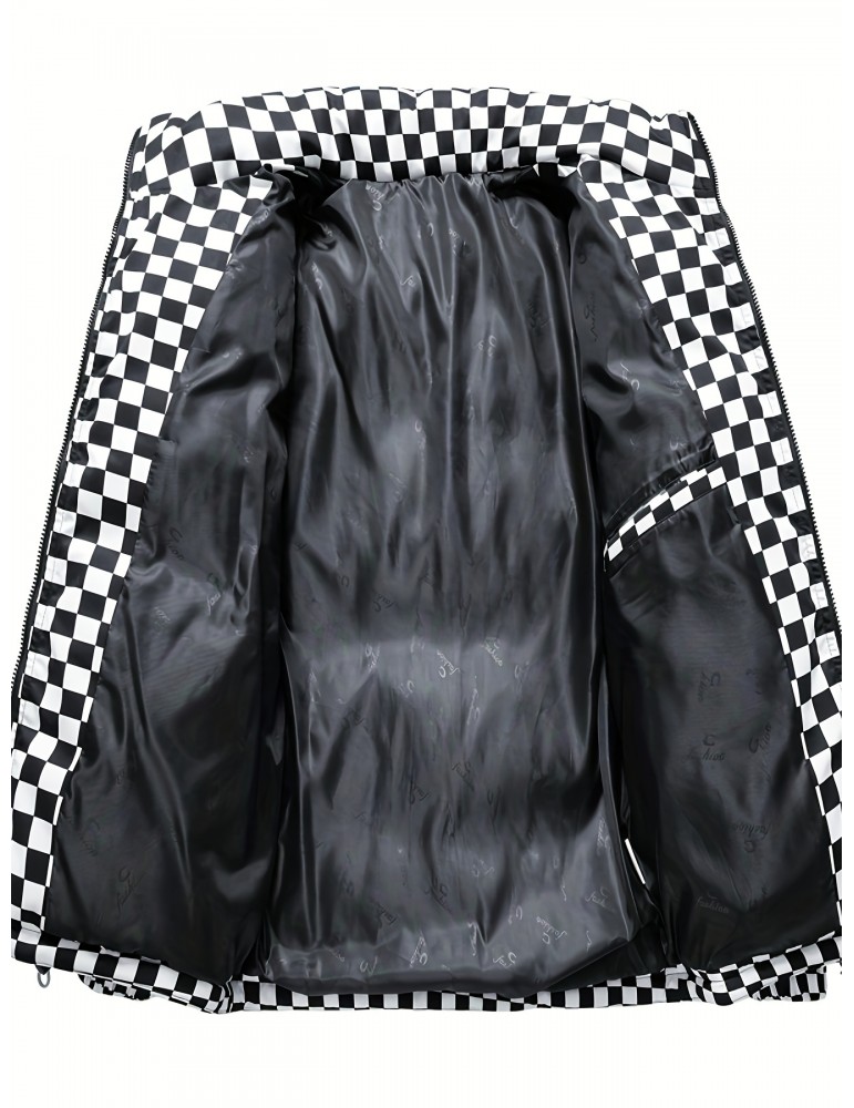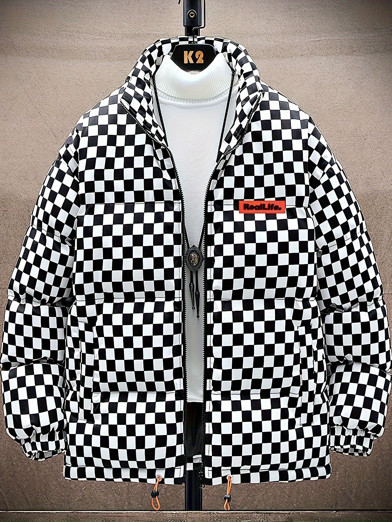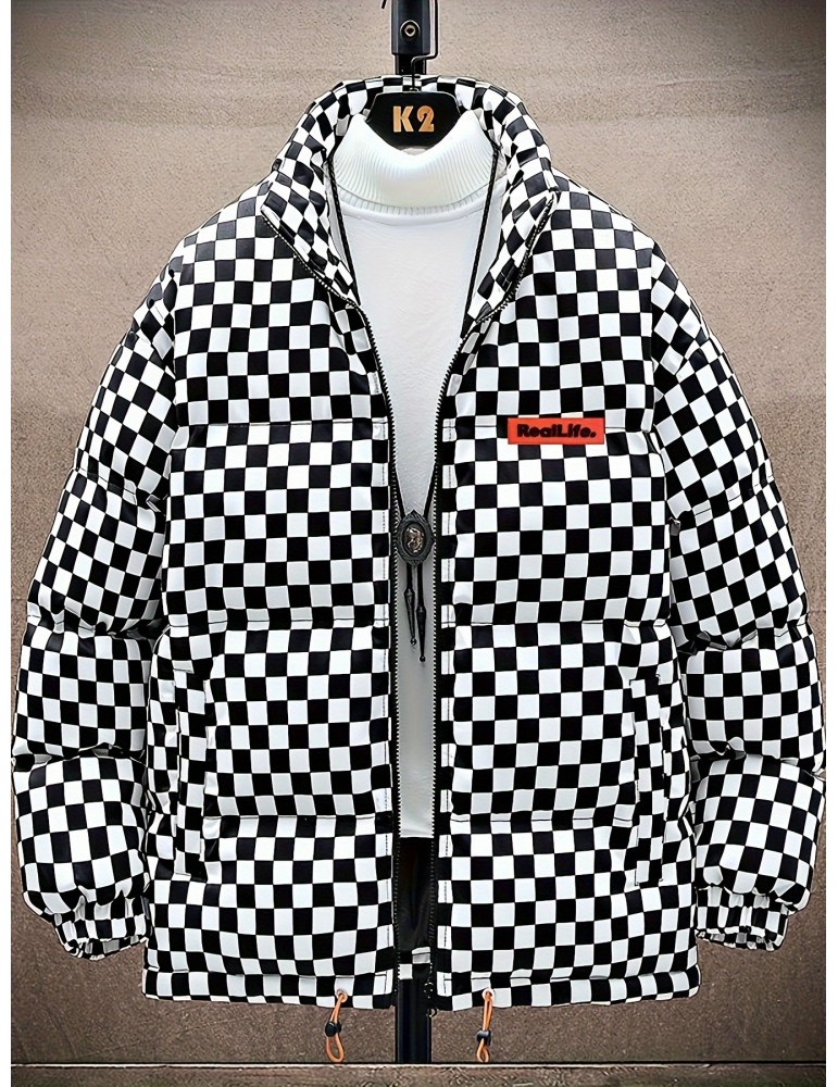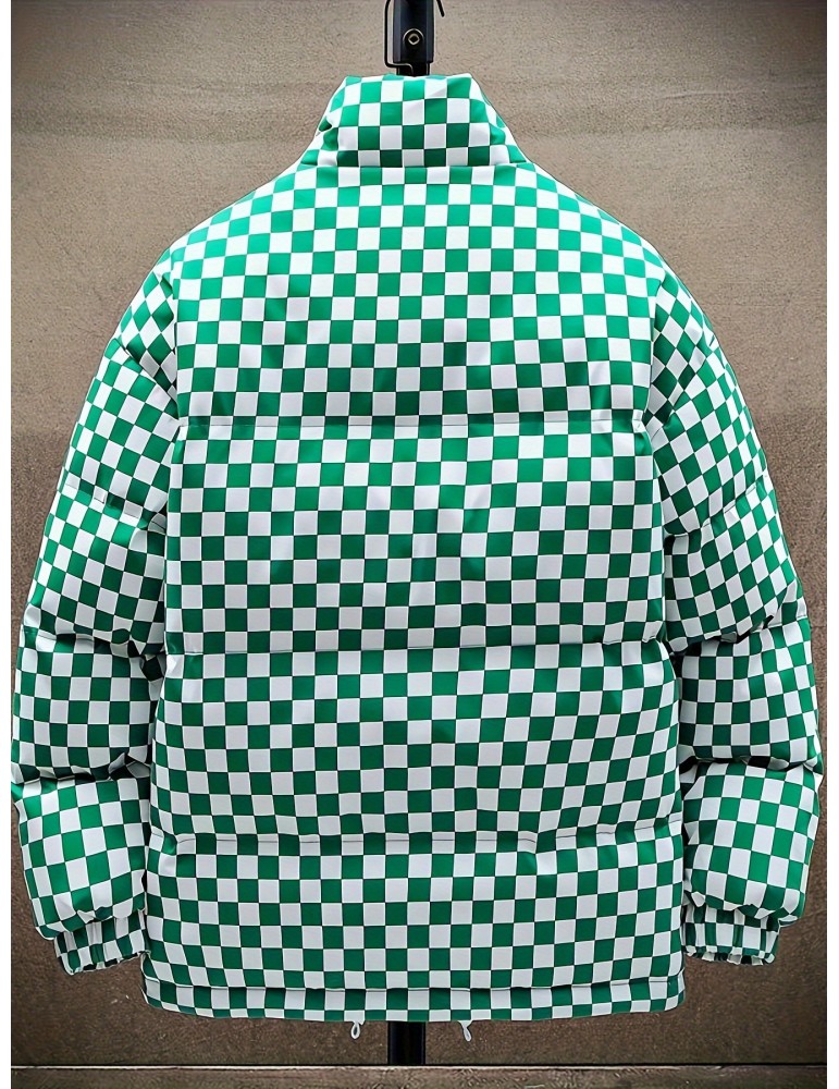 • Men's Stylish Checkered Puffer Coat With Pockets, Casual Breathable Stand Collar Zip Up Long Sleeve Warm Top For City Walk Street Hanging Winter Outdoor Activities